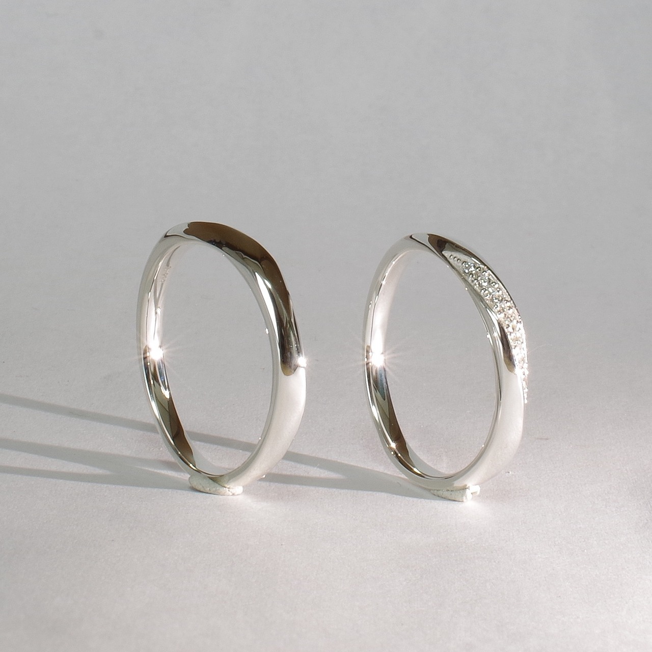 S字のラインの指輪の正面にひとひねりのラインを加えたペアリング