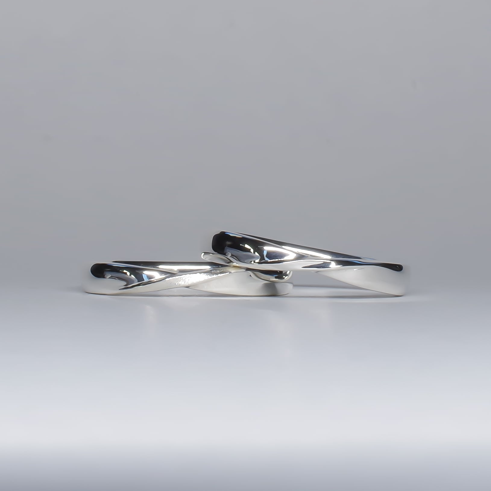 正面のひねりはレディース鏡面仕上げ、メンズは荒目のマット仕上げ